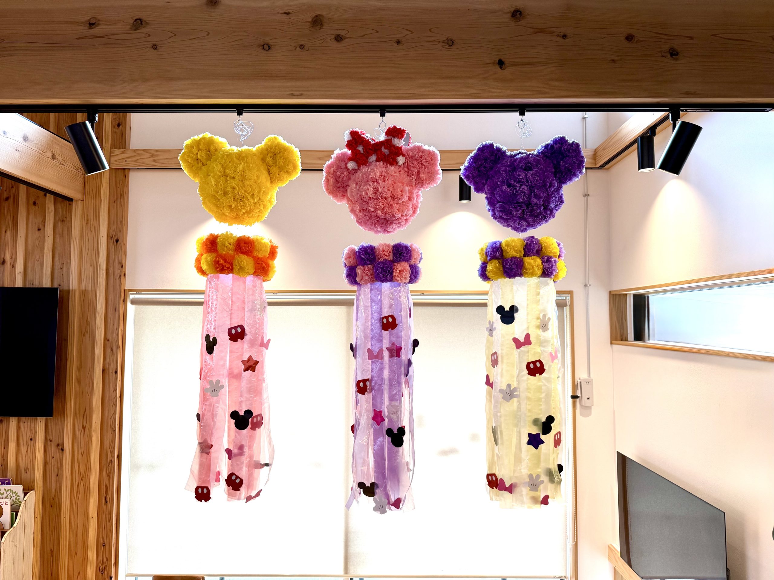 7月から飾ってある待合室の七夕飾りは、しまうま保育室の保育士たちが手作りしました。